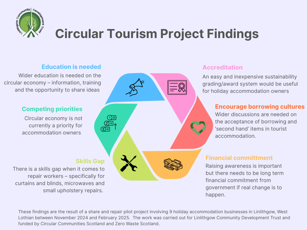 Our project started with a pilot scheme linking up to 12 tourist accommodation providers with our Repair Shop, specialist repair services and tourism-related items (e.g. travel cots, highchairs, games). This helped to save businesses money while reducing waste and increasing their green credentials.